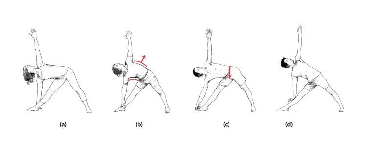Another cue that ignores the biomechanics of the knee. For most people there is no danger from straightening the leg fully, provided the pose is done mindfully and the quads are strongly engaged to prevent hyperextension. To continually micro-bend the knees misses the hamstring stretch in forward folds and is simply an unnecessary cue. (The exception is Yin Yoga where the intention is different.) Also, listen to your own body, especially in Triangle Pose where hyperextension in the front leg can be painful.